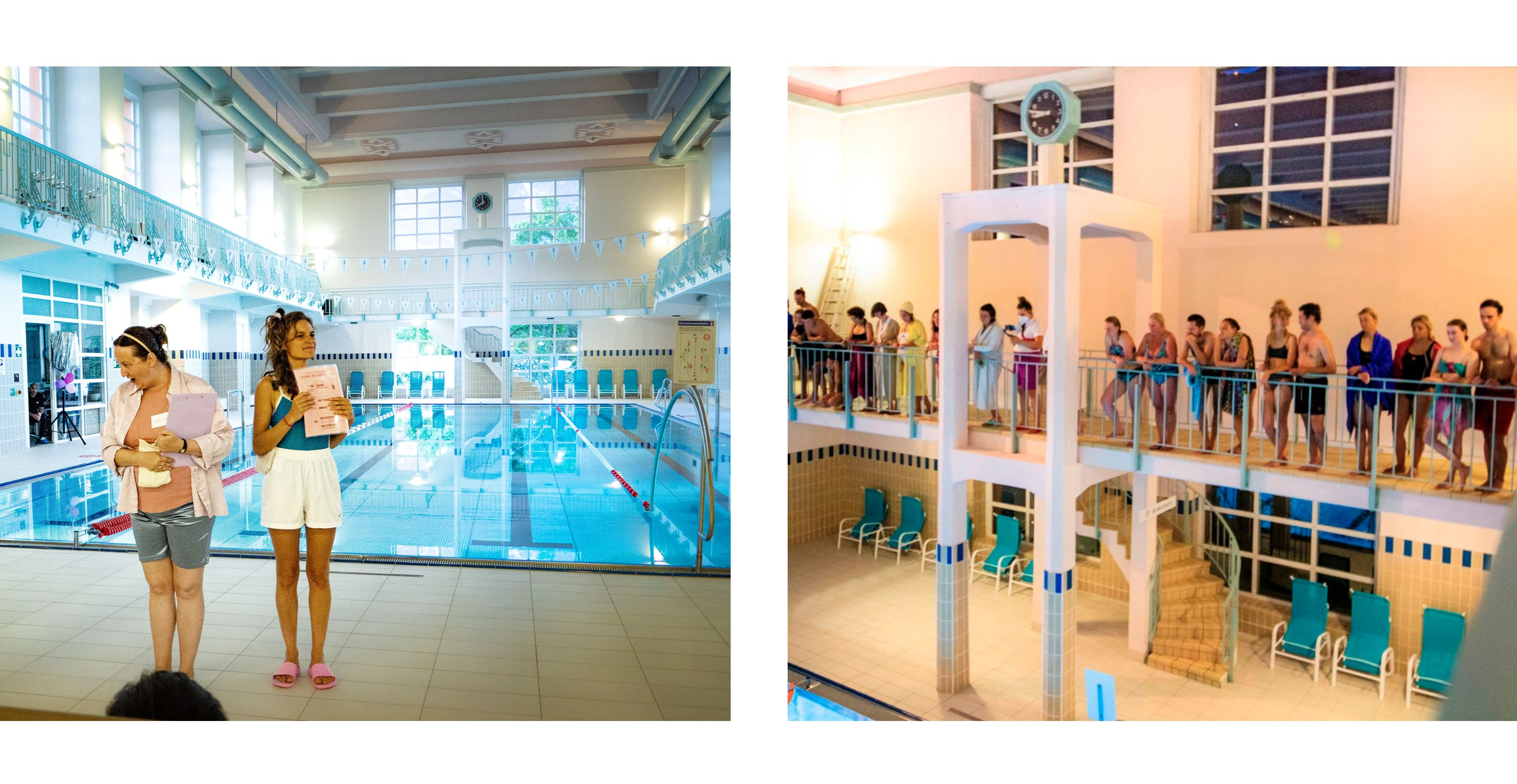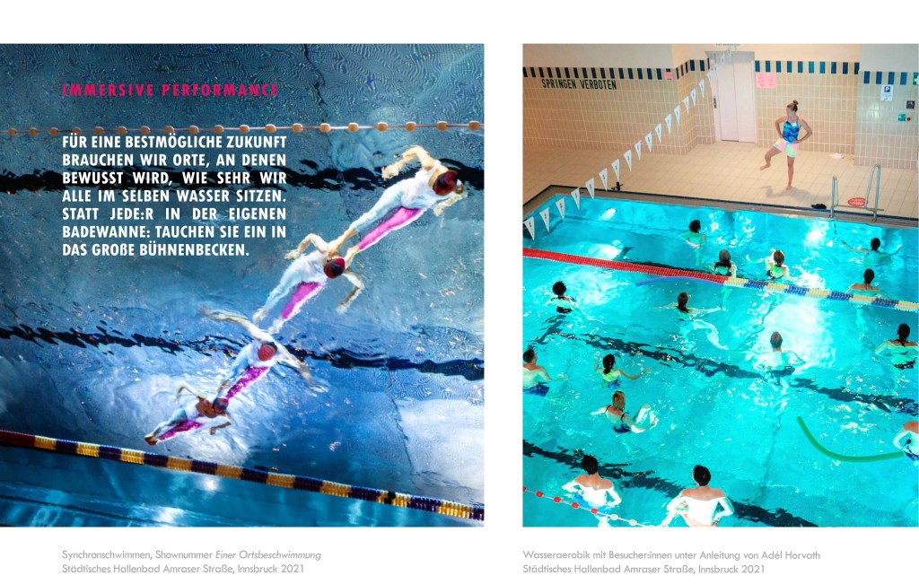 >> Ein Hallenbad ist ein bemerkenswert egalitärer Raum, ein Raum der Begegnung im ursprünglichsten Sinn. Denn in Badebekleidung sind alle Menschen gleich nackt: Reiche wie Arme, Rechte wie Linke, Einheimische wie Fremde treffen aufeinander wie sonst nirgends. […] Die Künstlergruppe um Elena Carr und Franziska Schindler nutzt diesen Umstand für eine lustvolle Performance in Becken, Sauna und Imbiss, aus Bad wird Bühne. […] erzählen experimentell, humvorvoll und bezaubernd von Nähe und Distanz in Zeiten der Vereinzelung, von Kindheitserinnerungen und der Kultur des gemeinsamen Badens. <<