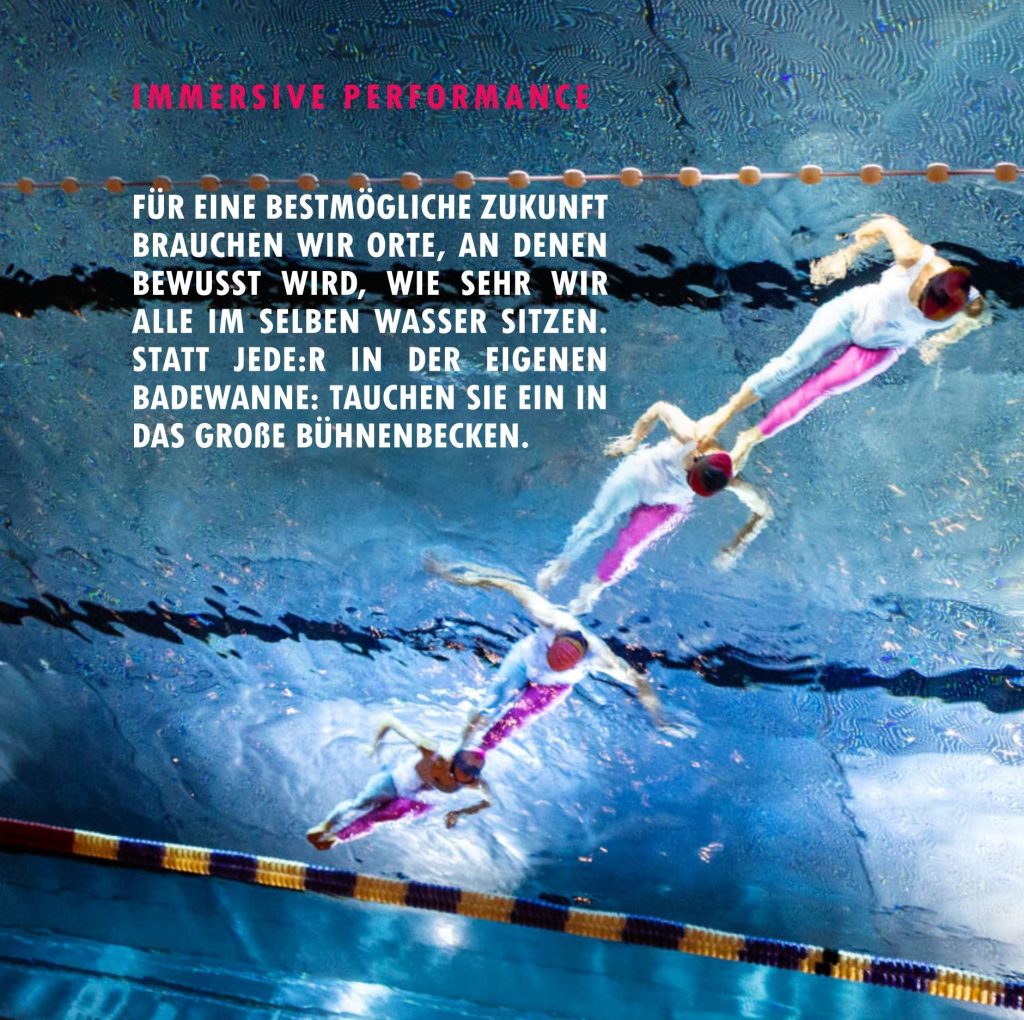 It’s bathing season, the Ortsbeschwimmung invites you onto the liquid parquet.Anecdotes from the cultural history of bathing are taken up in order to recognise the calming visit to the swimming pool as a strategy of everyday coexistence and thus to cultivate the common. We reactivate a past, collective ritual of bathing. Instead of everyone in their own bathtub: immerse yourself in the large stage pool, listen to the language of the performers that your body will understand. How you should sit in the sauna will be shown to you by the performer who has been assigned to you, watch the aquatic activities and find your own personal variation.
